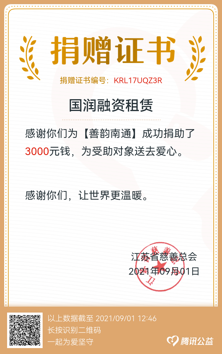 為大力弘揚中華民族扶貧濟困的優良傳統,發揮慈善在脫貧攻堅中的積極作用,按照市民政局等單位《2021年“博愛在南通 慈善暖江?!币蝗站杌顒臃桨浮返耐ㄖ?,國潤租賃組織全體員工于9月1日開展了線上一日捐活動。