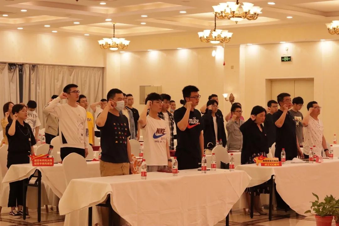 大家高舉右拳,在鮮艷的團旗下再次莊嚴宣讀入團誓詞,鏗鏘有力的宣誓聲回蕩在會場。